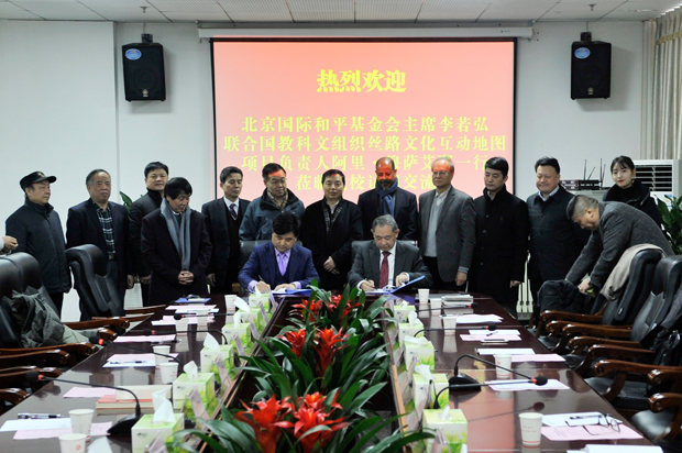 本网讯 1月30日上午,北京国际和平文化基金会主席李若弘,联合国教科文组织丝路文化互动地图项目负责人阿里·穆萨艾耶到我校访问交流。镐京集团董事局主席、校董事长吕明,党委书记胡鸿晓,学术委员会主任姜寿山,副校长吕超、温小郑、唐明晰,工会主席刘明夫,校长助理张斌崇等接待陪同。
